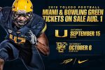 Single-game tickets for Toledo home football games vs. Miami (Fla.) Sept. 15 and Bowling Green Oct. 6 go on sale to the public Wednesday, Aug. 1, at 8:30 a.m.