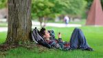 Clare Logan, a senior psychology student, relaxes under a tree on Centennial Mall during a late-morning break on Monday, the first day of classes for the fall 2025 semester.